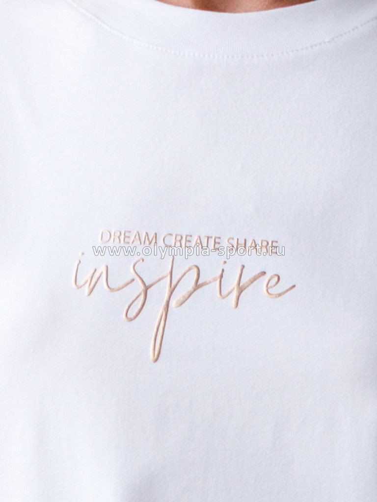 Перевод принта: Dream, create, share, inspire — мечтай, создавай, делись, вдохновляй. Футболка из премиального хлопка, высокое качество хлопковых волокон обеспечивает комфорт в любое время года. Горловина выполнена из рибаны в тон изделия, Рукава с подворотами и золотистым логотипом бренда. Авторский принт нанесен фактурными красками с устойчивым покрытием. За счет эластана в составе идеально держит форму и сохраняет внешний вид в течение долговременного использования. Универсальная вещь для ваших стилистических решений.